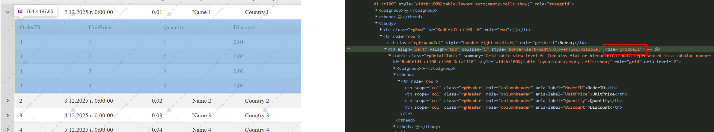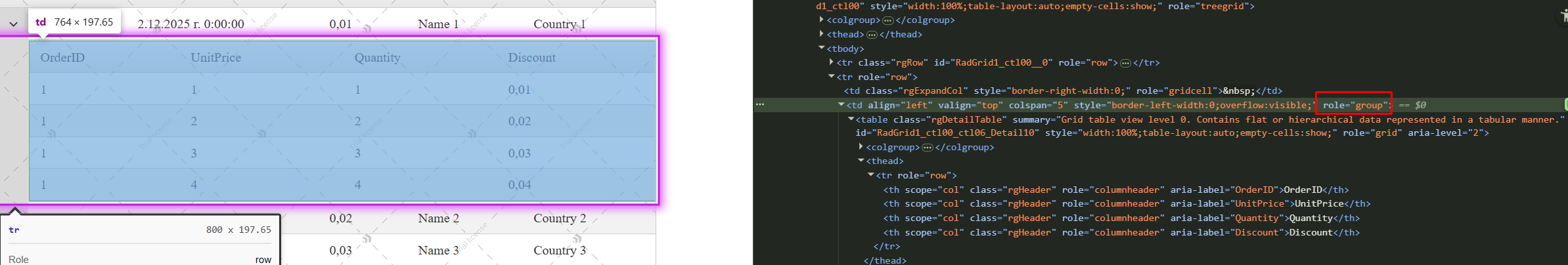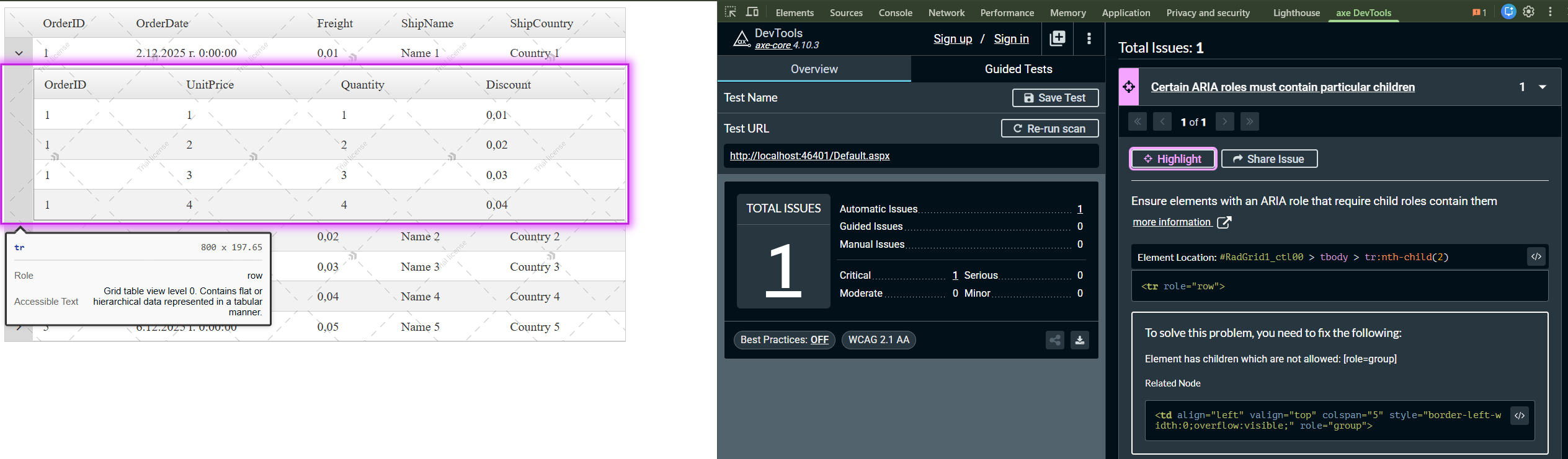 Specifically, the logic that assigns role="group" to the parent <td> element of a detail table is misplaced. That cell should retain its natural role as a gridcell, and overriding it leads directly to the accessibility violations reported by axe DevTools.