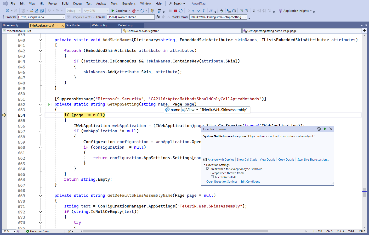 I recently upgraded the Telerik version from 2025.1.416 to 2025.3.825, and started getting this NullReferenceException during debugging.