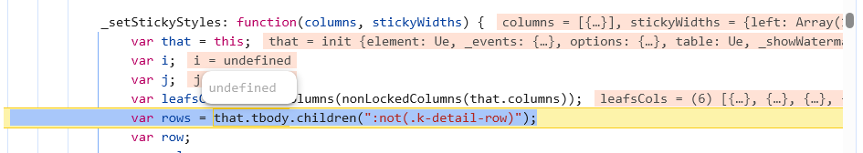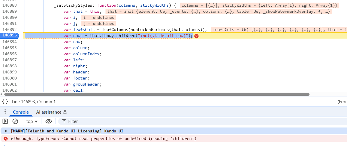 The error thrown in the DevTools console indicates that the grid's "tbody" property is not created at the time it is trying to call _setStickyStyles.