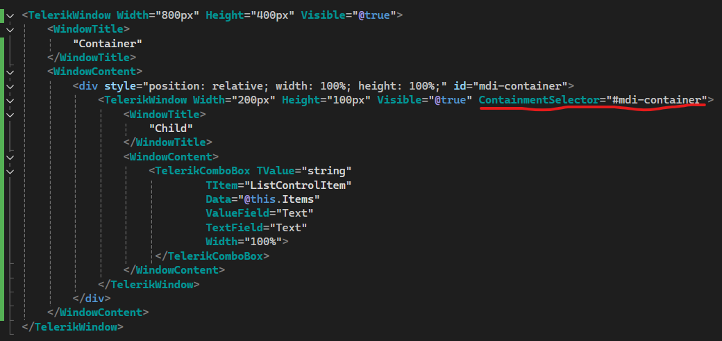 When a TelerikComboBox is defined inside a window and the ContainmentSelector attribute is set for that window, the ComboBox exhibits erratic behavior: it sometimes fails to open, and selections from the dropdown may not register. Overall, the ComboBox does not function reliably in this configuration.