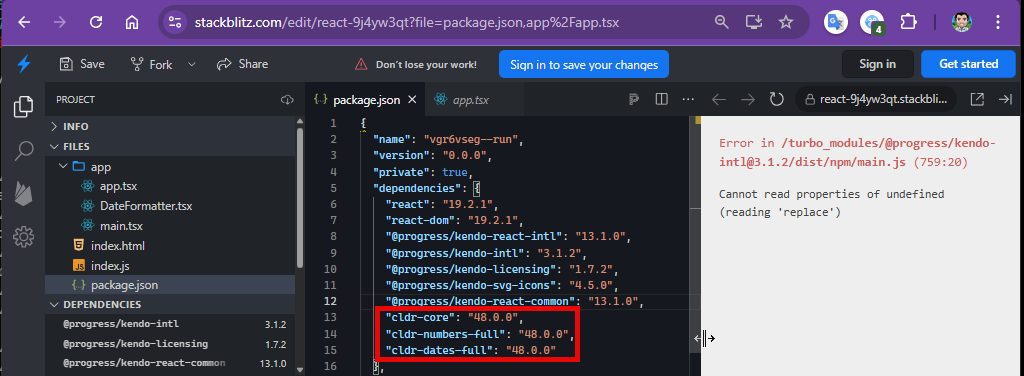 The examples from https://www.telerik.com/kendo-react-ui/components/intl/i18n/loading-data work with cldr* packages up to version 47.0.0. The Current version 48.0.0 causes an error: