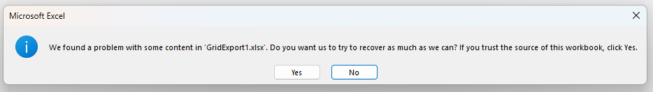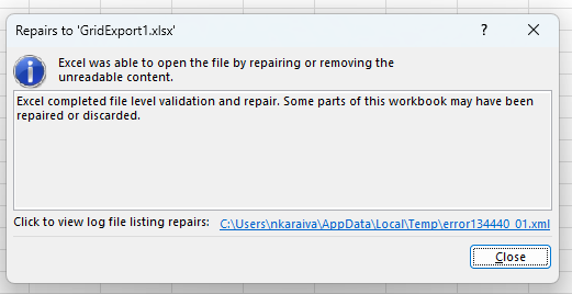 The content is exported correctly, but the following error occurs: